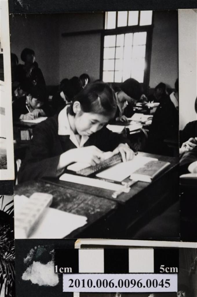 一女學生於教室座位上撥算盤之照片