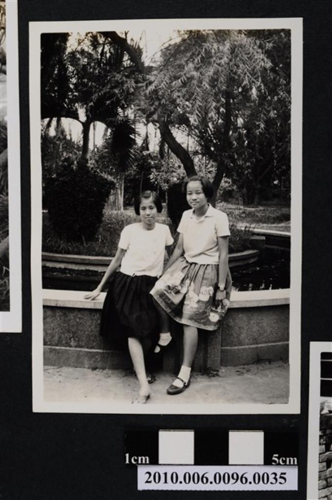 二位女子坐於水池矮池牆合影之照片