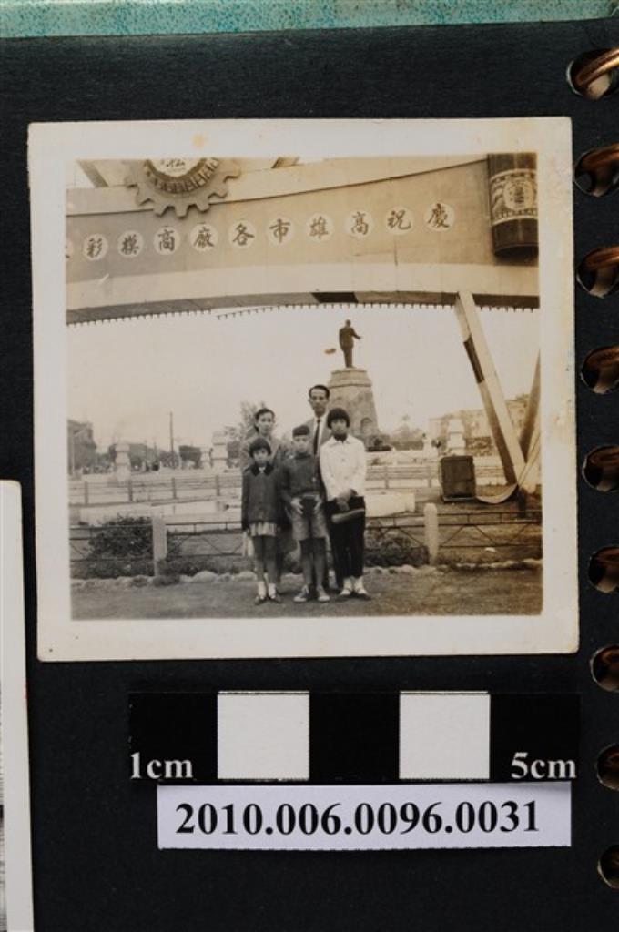 五人站立於慶祝高雄市各廠商摸彩大會大型活動拱門前合影之照片