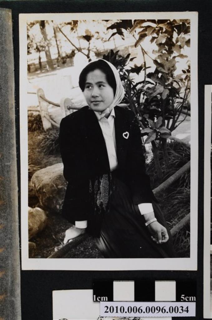 一女子頭綁頭巾坐於欄杆獨影之照片