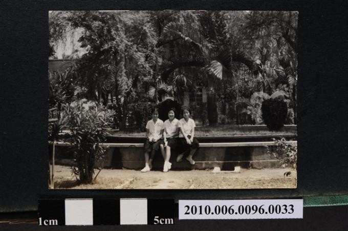 三位女子身穿制服坐於水池旁合影之照片