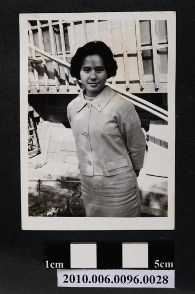 一女子身穿正式服裝站立於屋外窗前獨影之照片