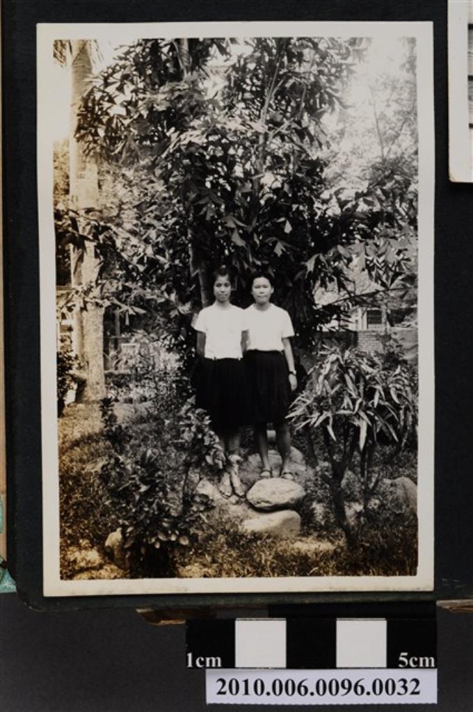 二位女子站立於樹叢中合影之照片