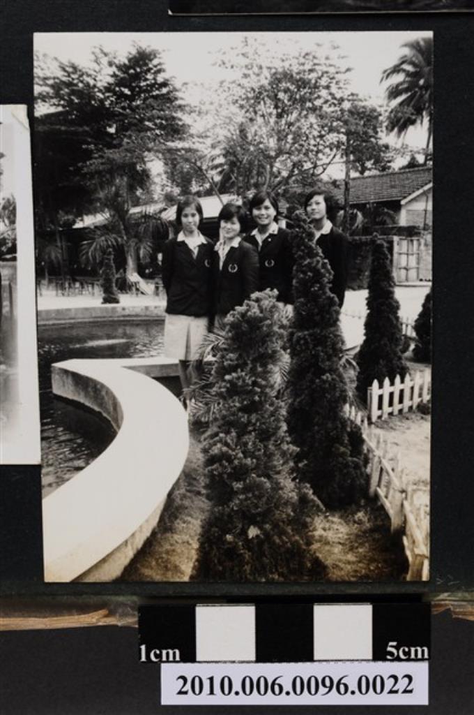 四位女子站立於水池旁合影之照片