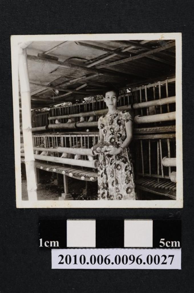 一婦人手捧一盆雞蛋站立於雞舍內獨影之照片