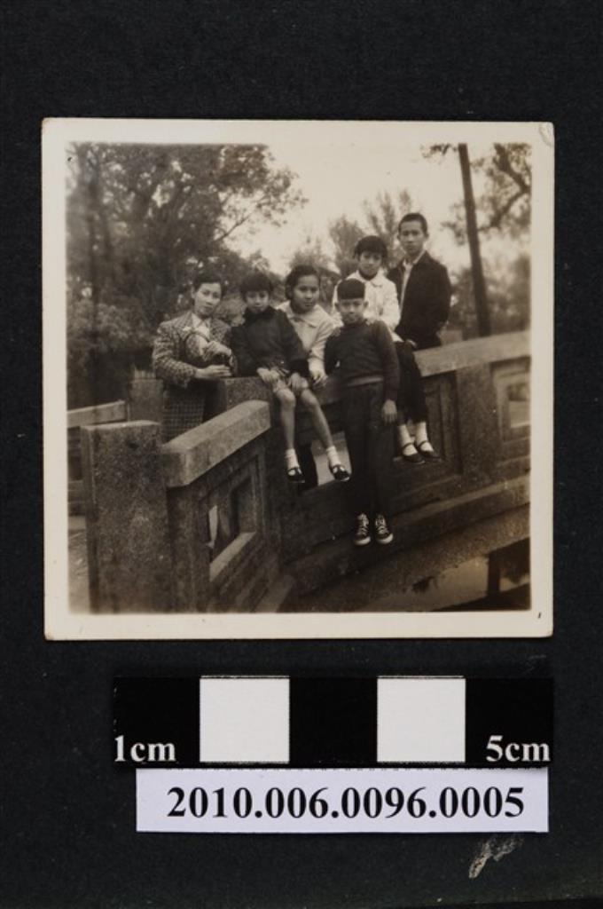 六人依靠於拱橋欄杆合影之照片