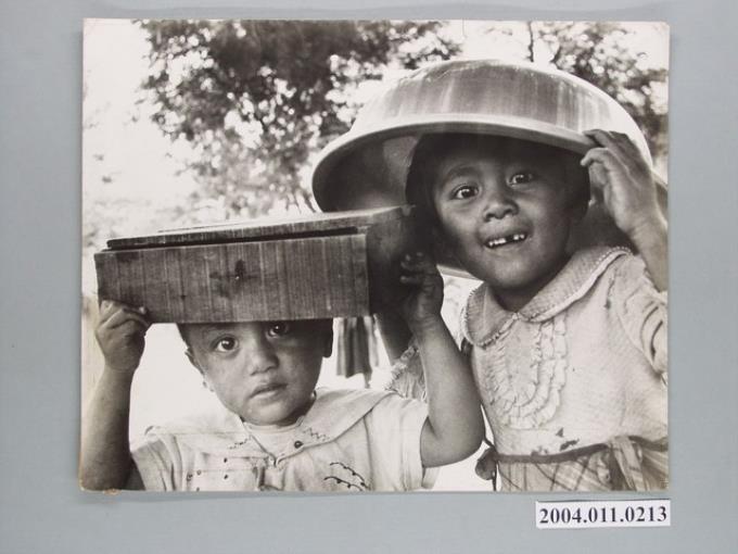 2名孩童頭戴盆狀容器