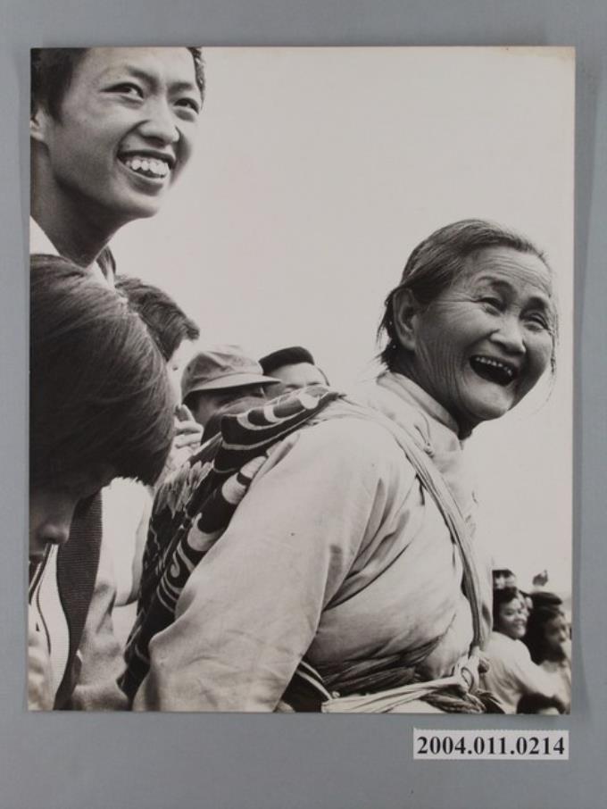 揹著幼童的老婦開懷大笑