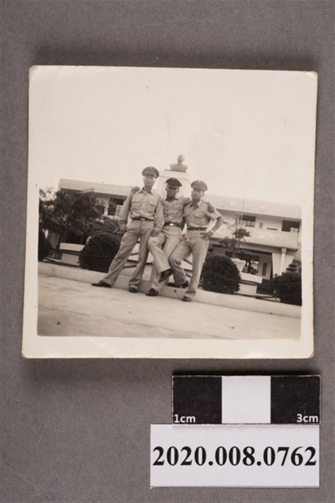 3名男子於建築雕塑前合照