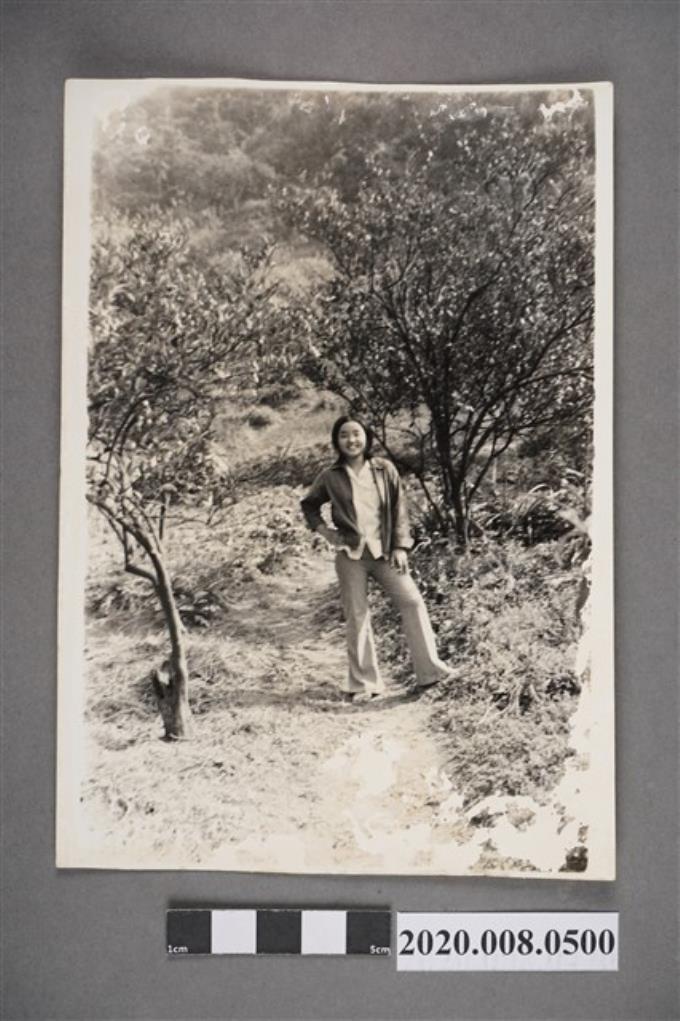 女子於樹林間獨照
