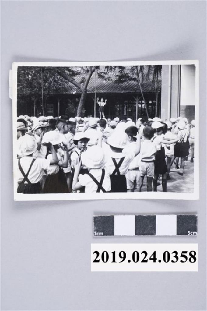 柯潔芳在台上指揮一年級做早操