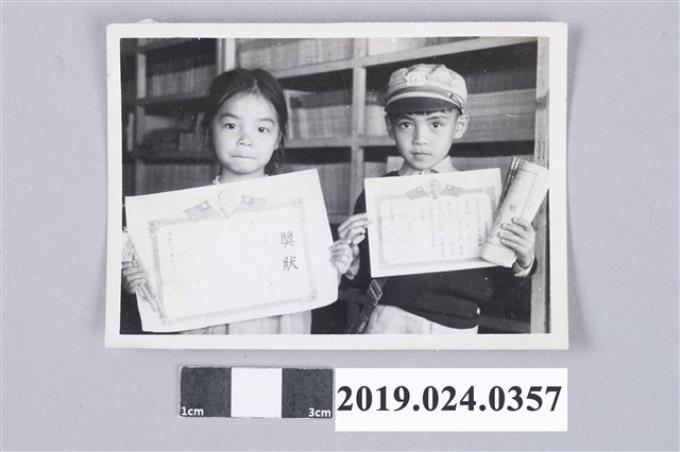 柯潔芳與柯志明於第一出版社前持獎狀