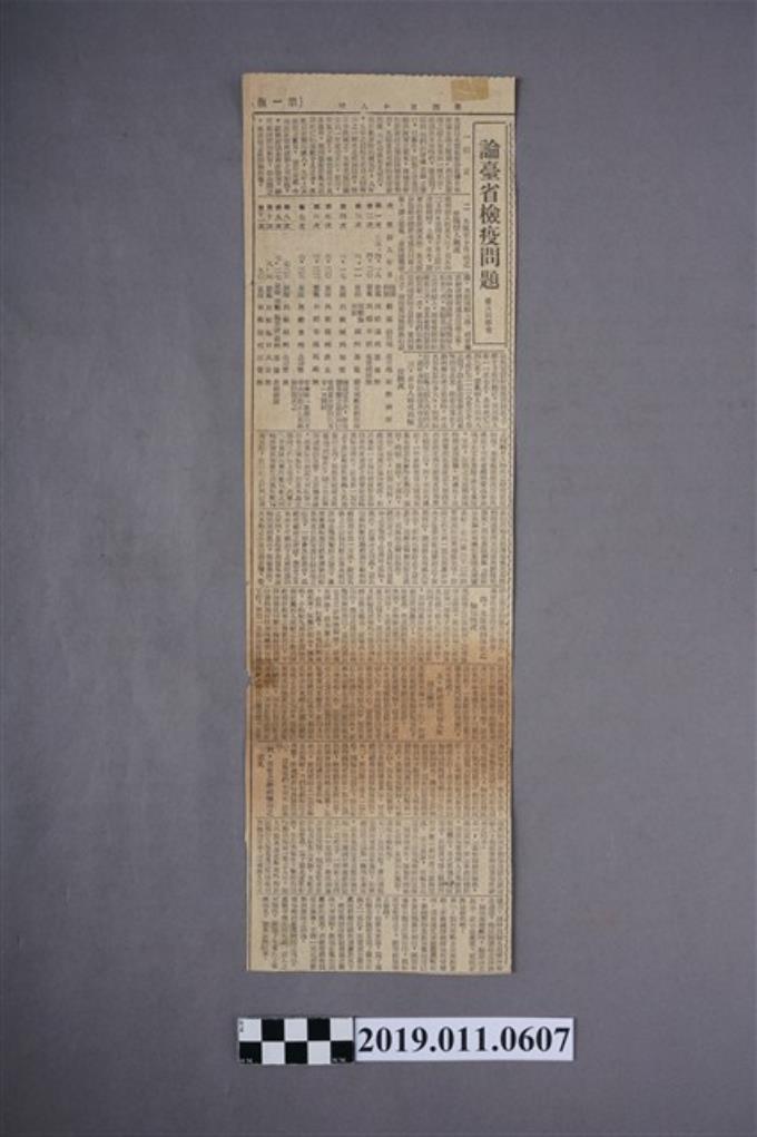 「臺灣新生報」有關「論台省檢疫問題」之報導