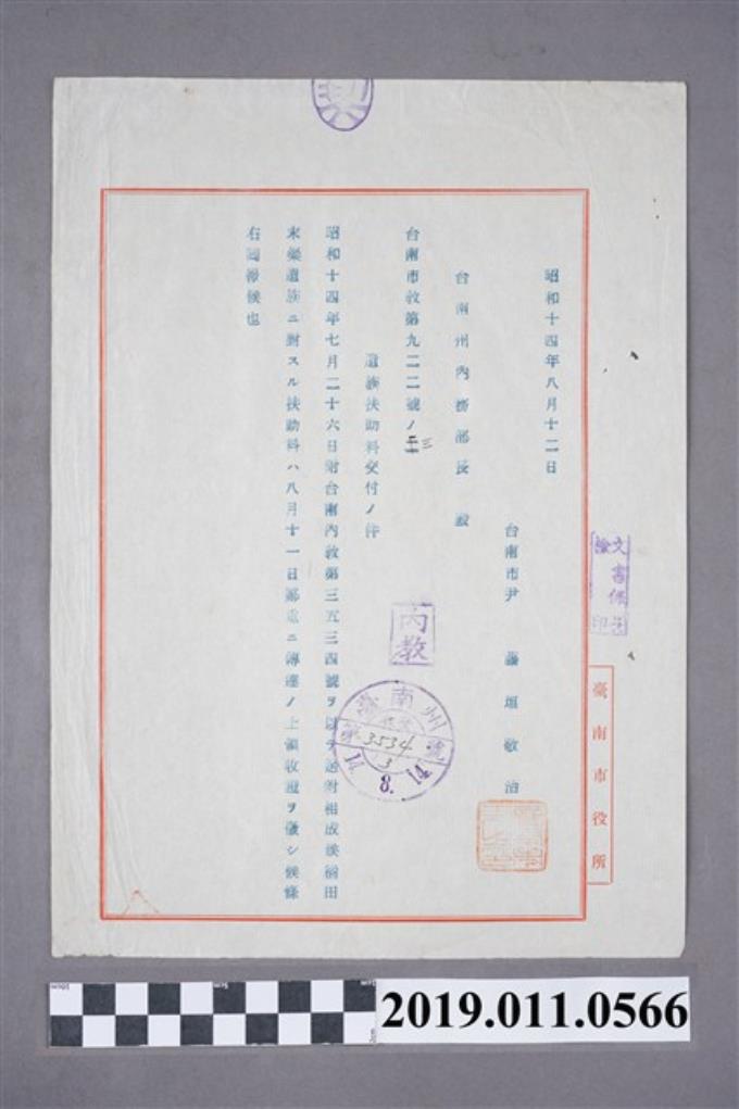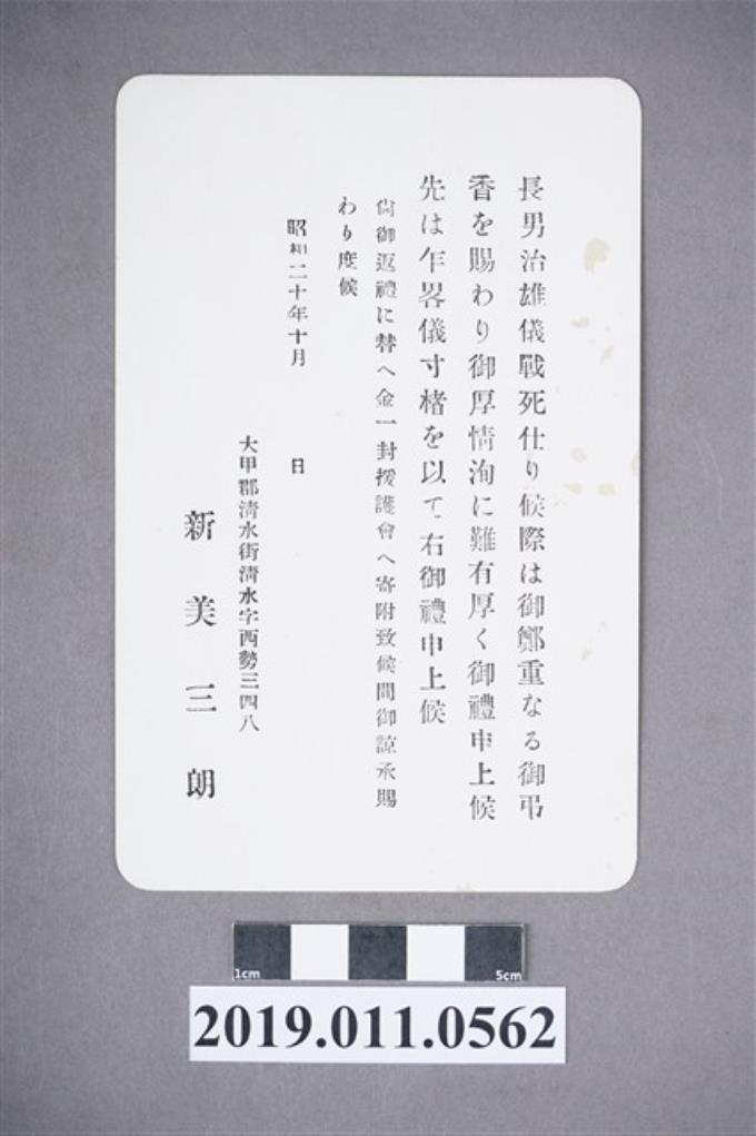 陣亡的在台日本兵家屬致參加追悼會儀式感謝函