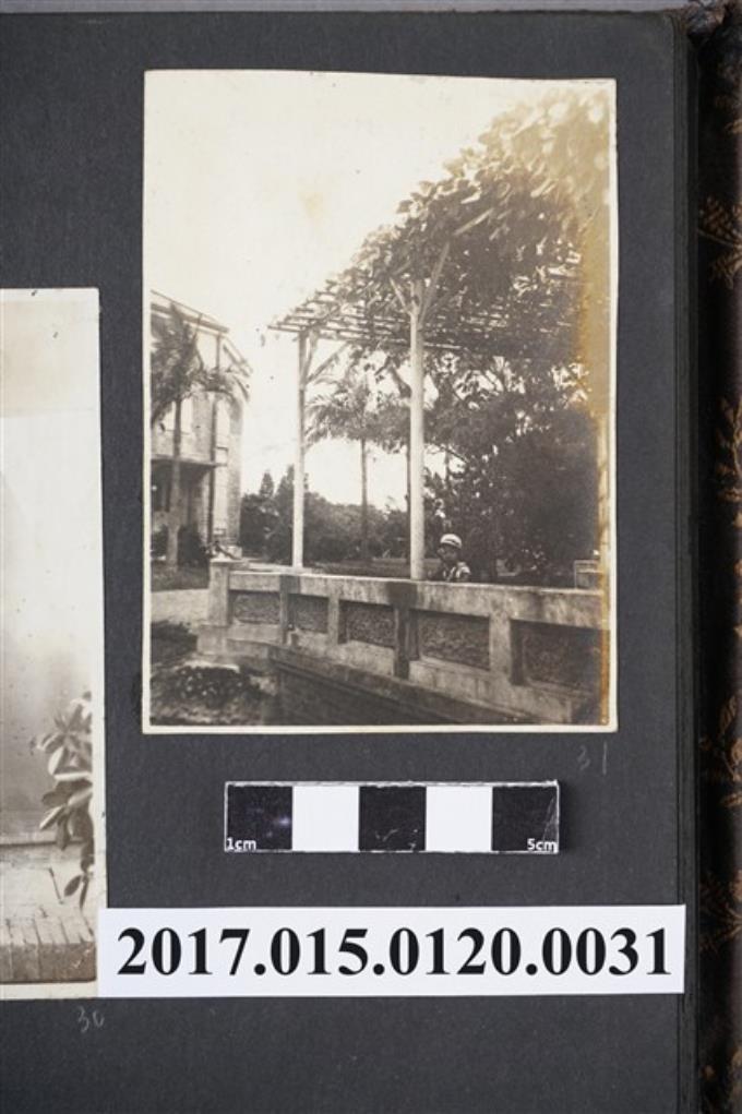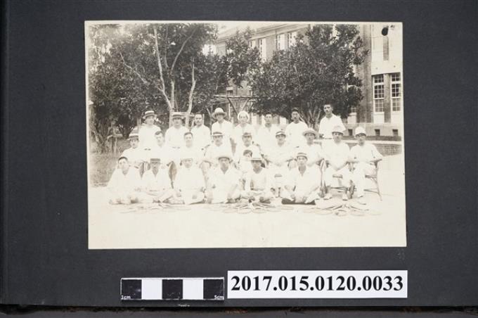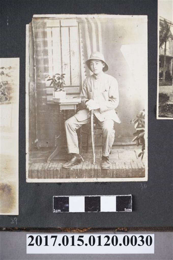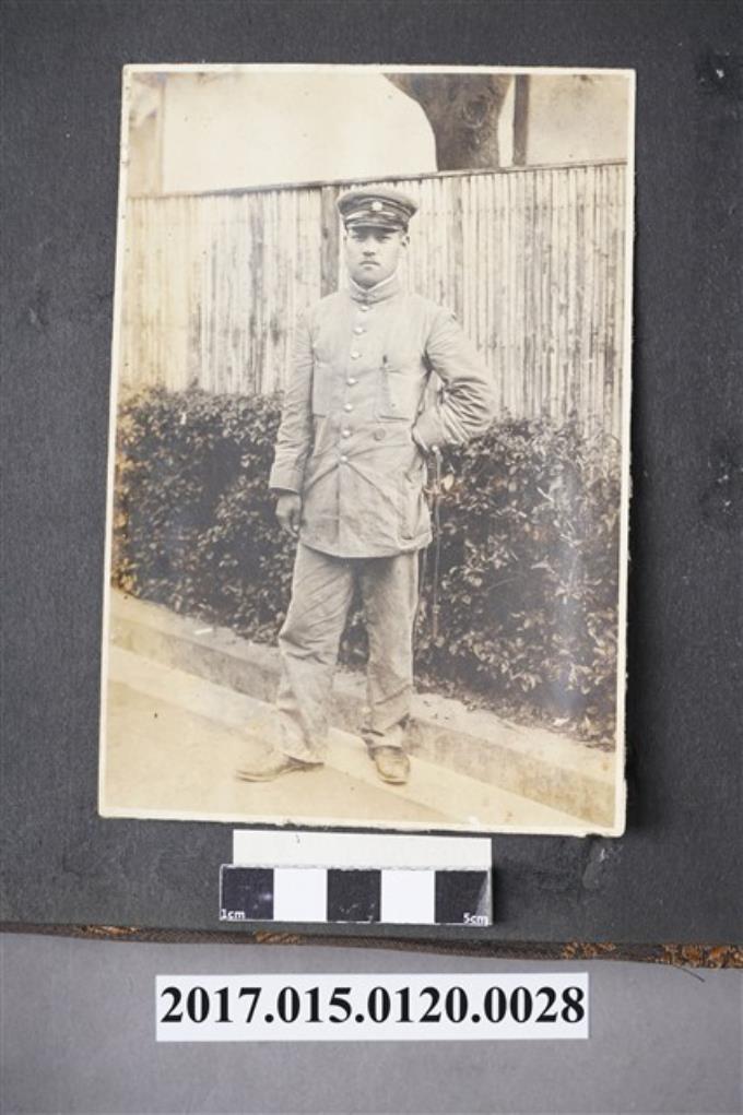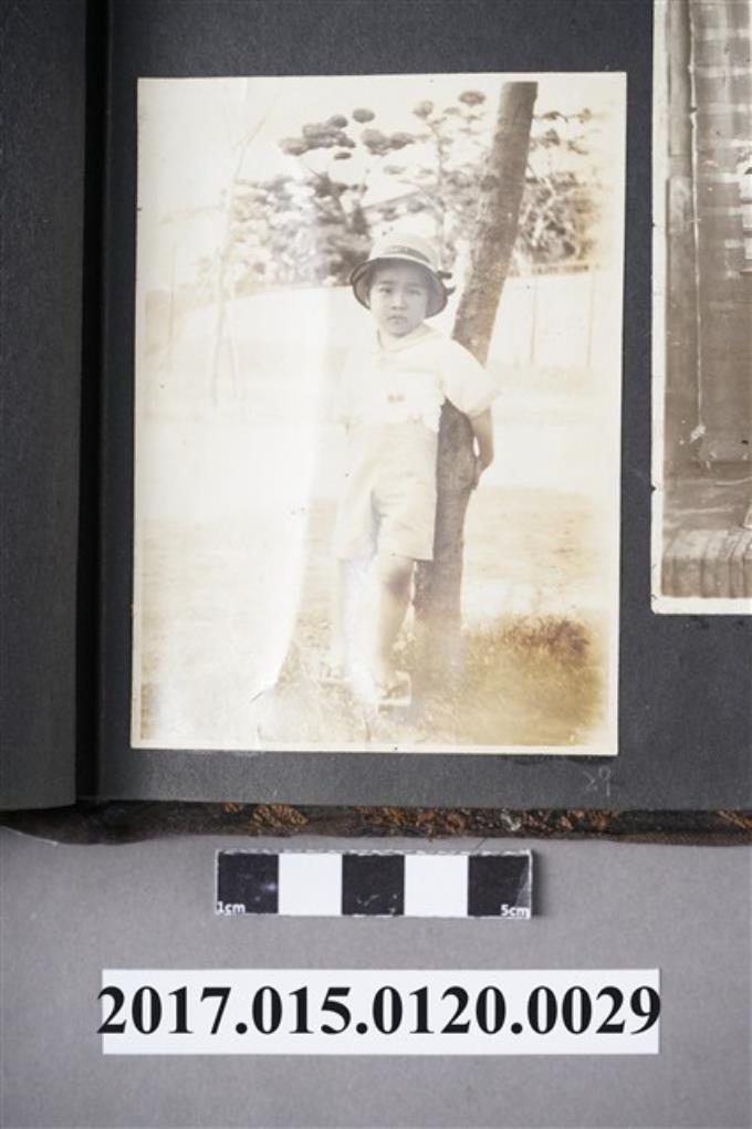 一位穿著小學制服並戴著帽子靠在樹上的小孩照片