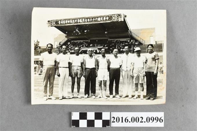 張星賢與日籍友人吉岡隆德等人參加台灣區第二十九屆田徑賽大會–高齡會比賽於嘉義體育場合照
