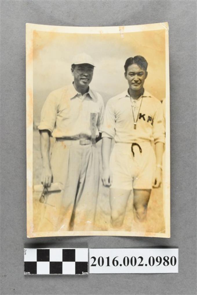 張星賢擔任自由中國臺灣田徑隊副總領隊遠征菲律賓,隊長陳英郎獻勝利獎盃於馬尼拉黎沙運動場合照