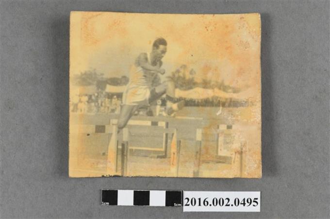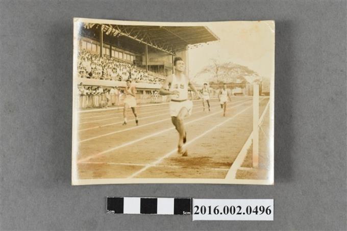 台灣田徑代表隊陳英郎選手遠征菲律賓勇奪四百公尺競賽冠軍衝線照片