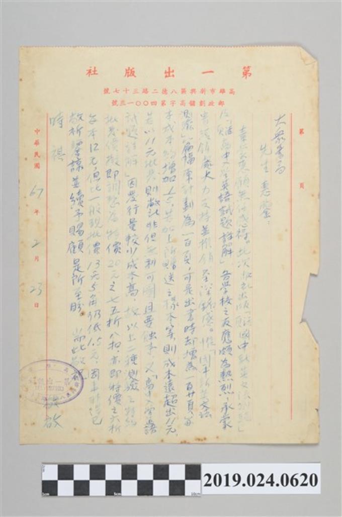 1978年2月23日柯旗化第一出版社用信箋,寄予大眾書局