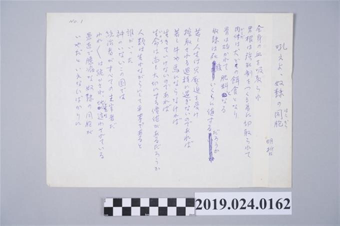 柯旗化詩作〈吼吧,奴隸的同胞〉日文手稿