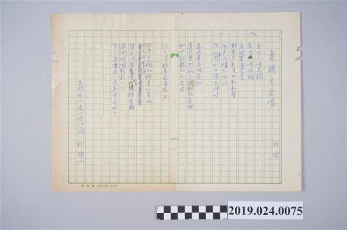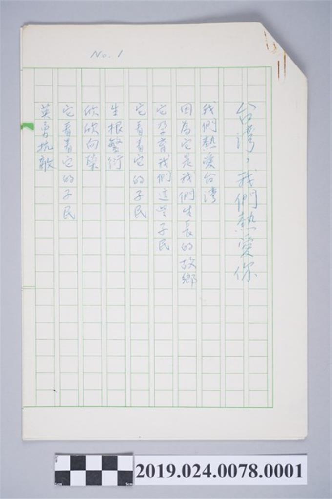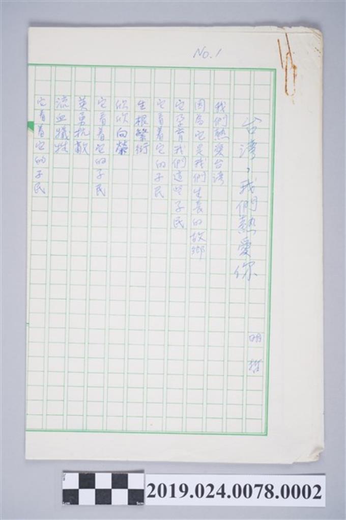 柯旗化詩作〈台灣,我們熱愛你〉複寫稿
