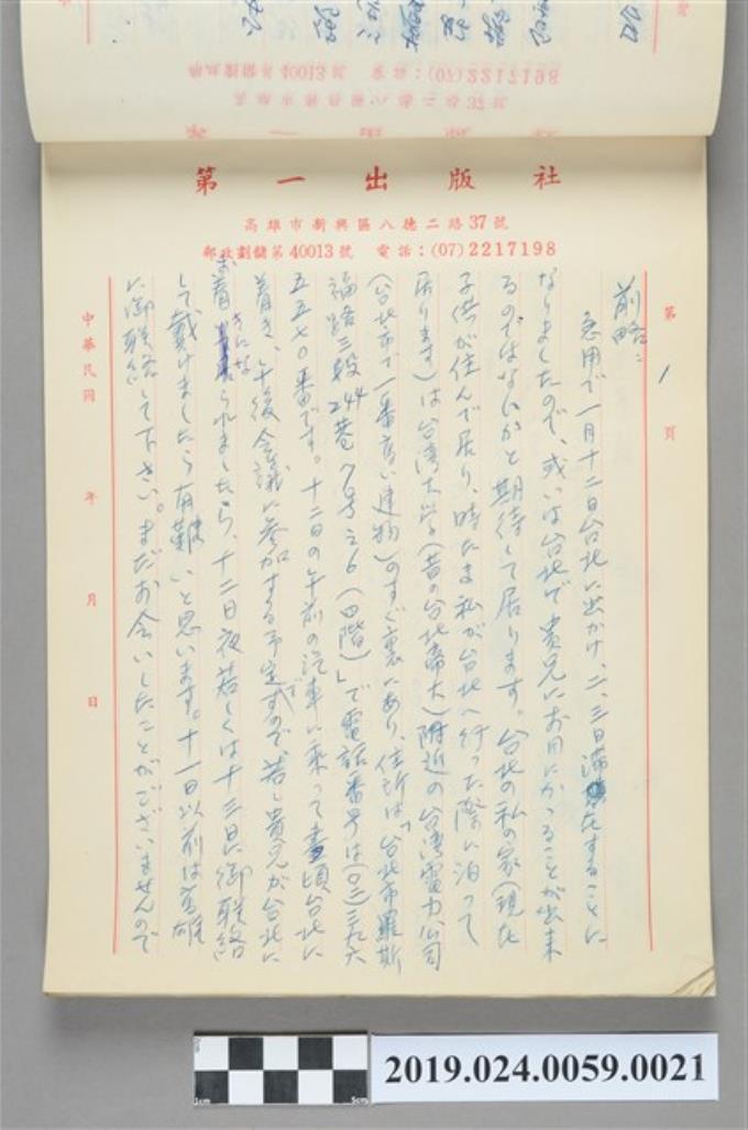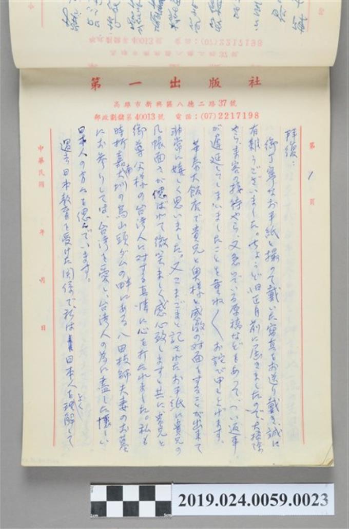 1986年2月16日柯旗化寄給宇敷民夫之信件
