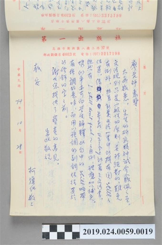 1985年10月28日柯旗化寄給「廖老師」之信件