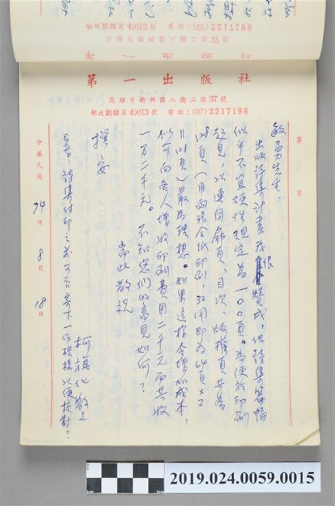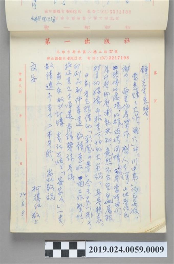 1985年6月8日柯旗化寄給鍾肇政之信件