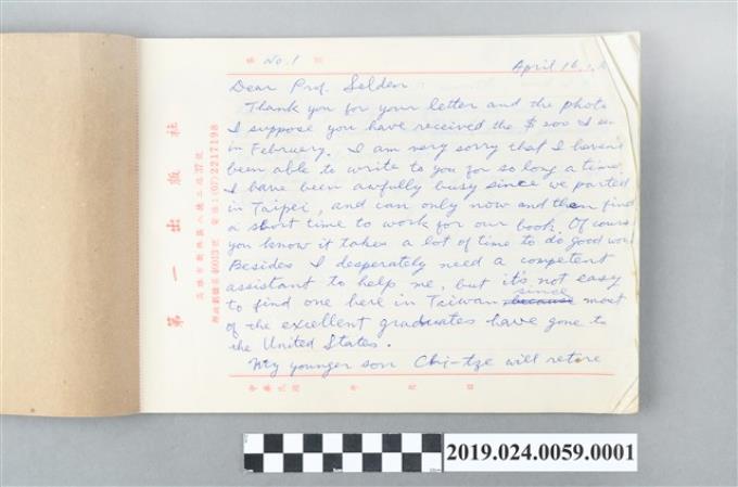 1985年4月16日柯旗化寄給Mark Selden教授之信件