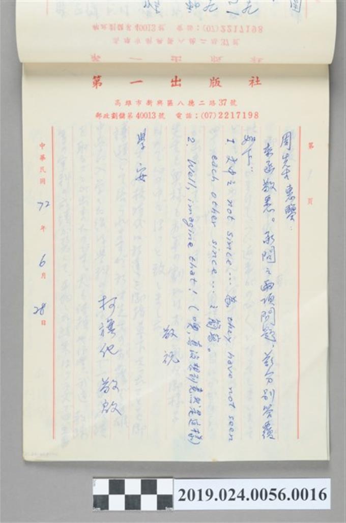 1982年11月10日柯旗化寄給臺灣師範大學英語系之信件