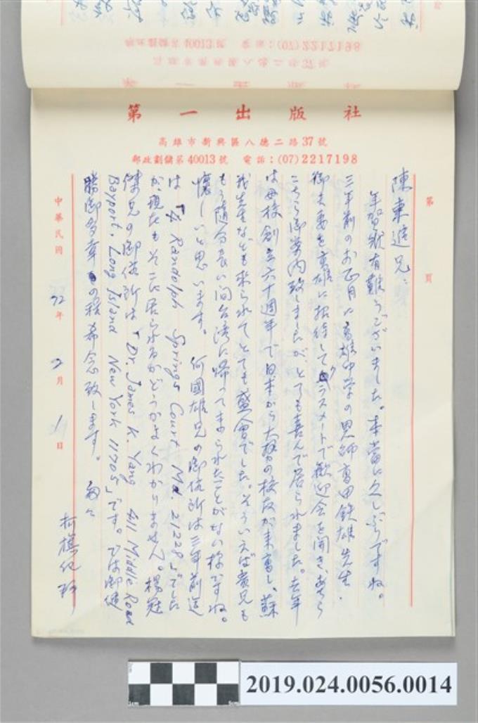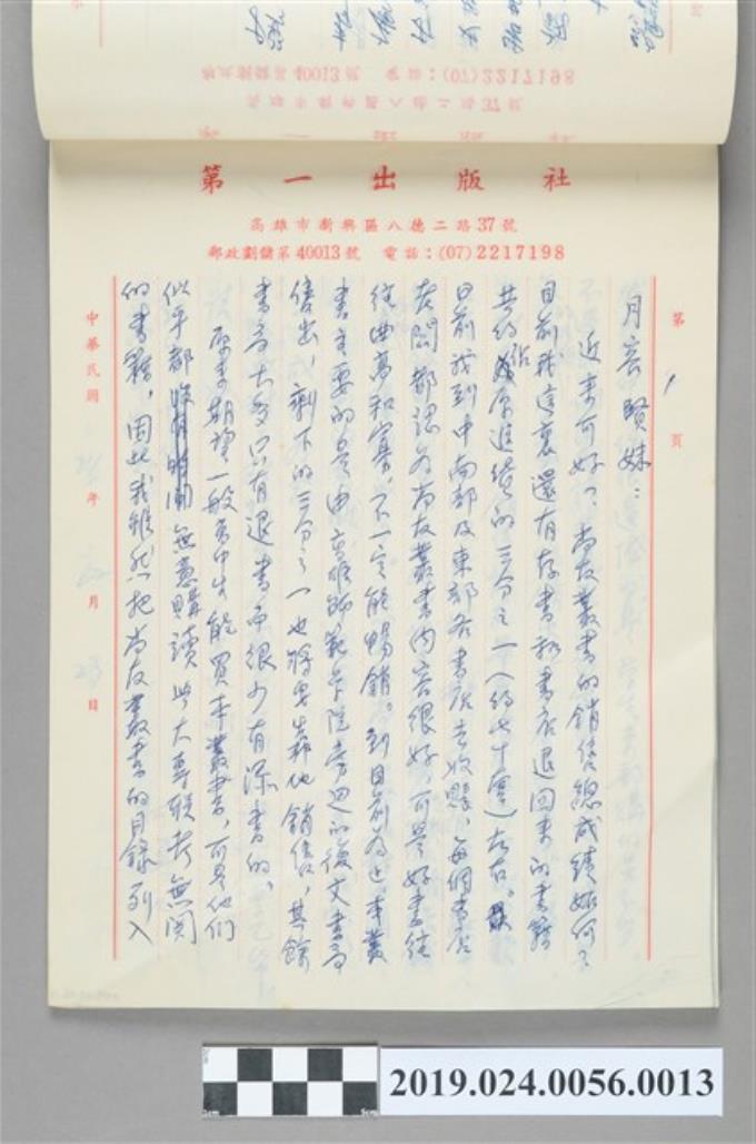1982年12月23日柯旗化寄給「月容賢妹」之信件