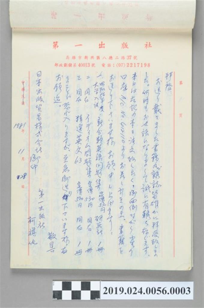1980年11月28日柯旗化向日本出版貿易株式会社購書之信件