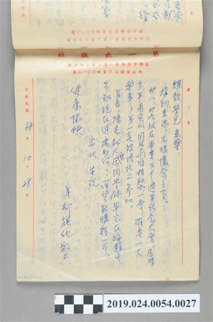 1979年10月28日柯旗化寄給「耀敦學兄」之信件