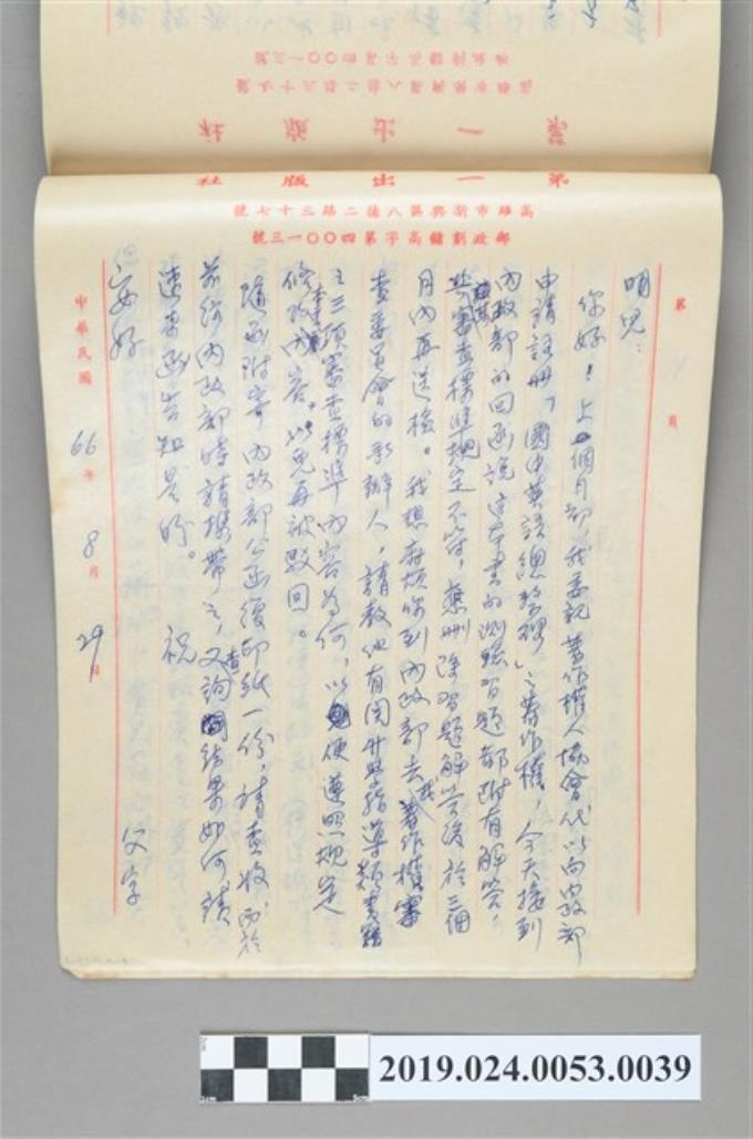 1977年8月29日柯旗化寄給長子柯志明之信件