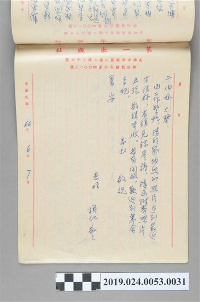 1977年6月7日柯旗化寄給二伯母之信件