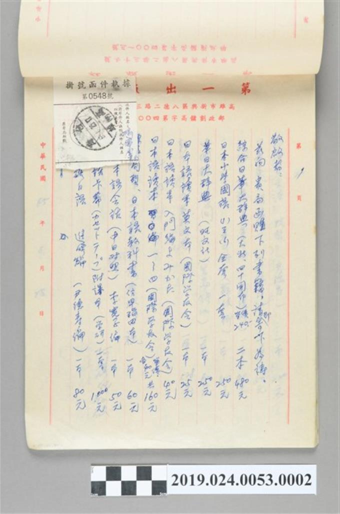 1976年6月25日柯旗化向鴻儒堂書局購書之信件