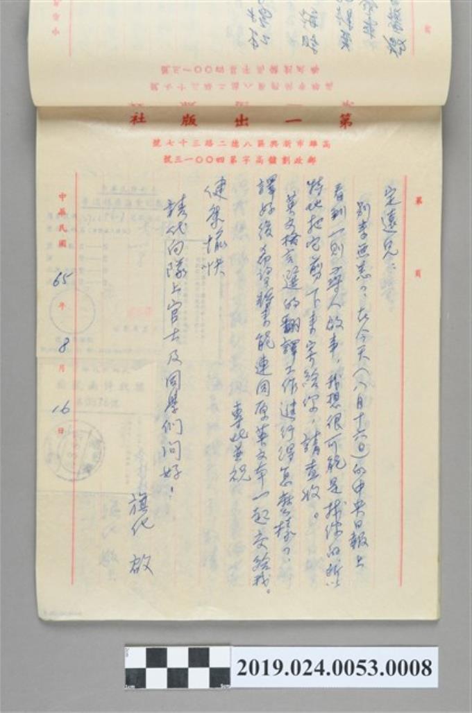 1976年8月16日柯旗化寄給獄友吳定遠之信件