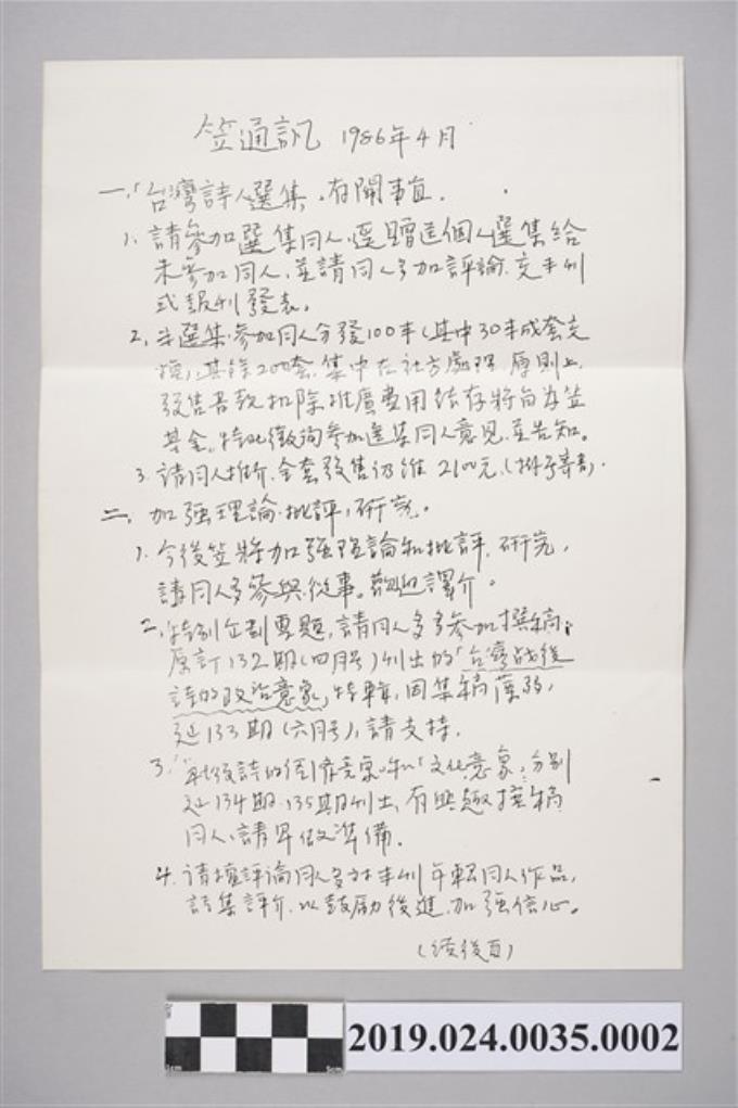 笠詩刊社寄柯旗化笠通訊之內容(1986年4月12日)