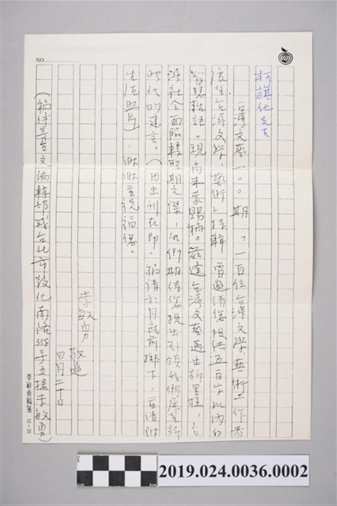 李敏勇寄柯旗化台灣文藝邀稿信件(1986年4月20日)