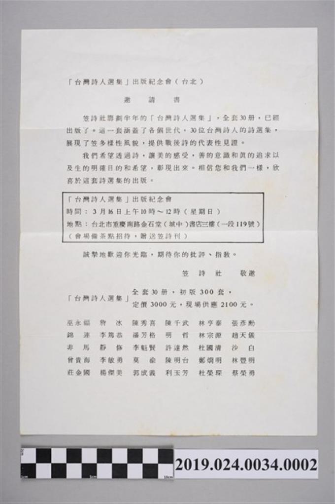 笠詩刊社寄柯旗化《台灣詩人選集》出版紀念會邀請函(1986年3月9日)