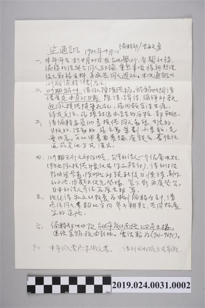 笠詩刊社寄柯旗化笠通訊之內容(1985年9月2日)