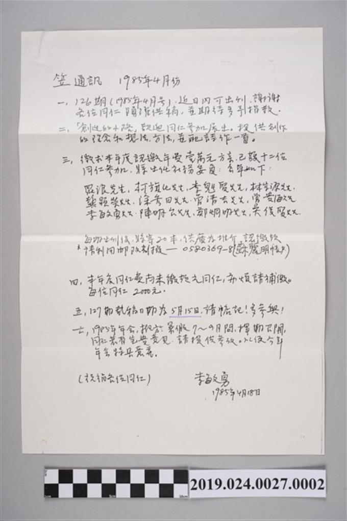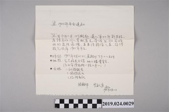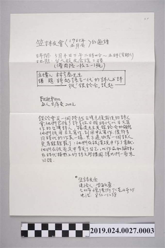 柯旗化收到1985年笠詩刊社年會通知單