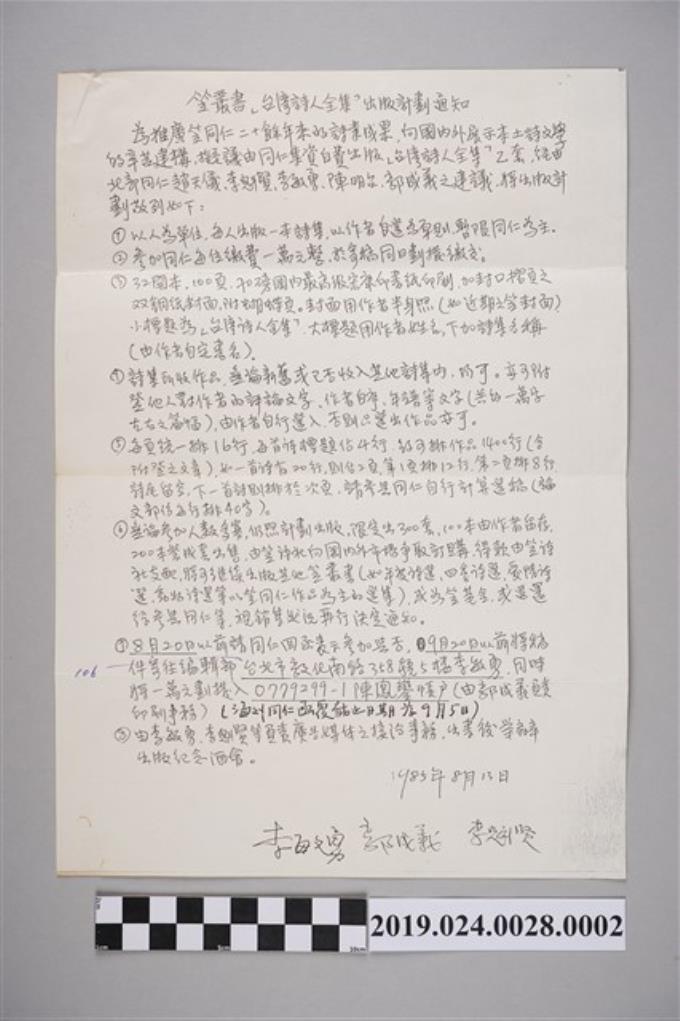 柯旗化收到笠叢書《台灣詩人全集》出版計劃相關文件