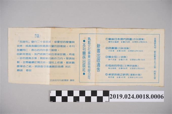 笠詩刊社致訂閱者函暨新書出版通告(1985年1月15日)
