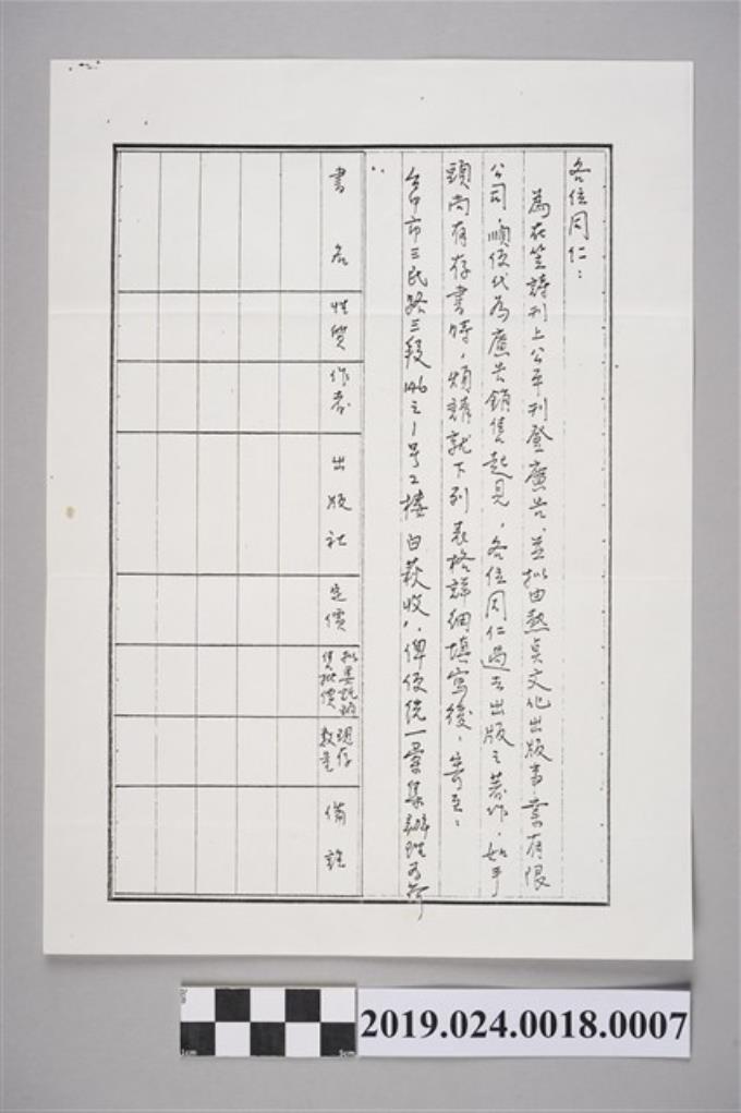笠詩刊社徵求作者存書函(1985年1月15日)