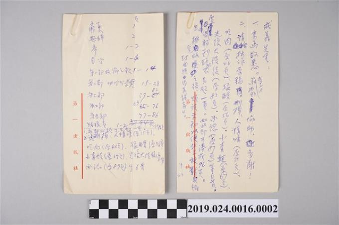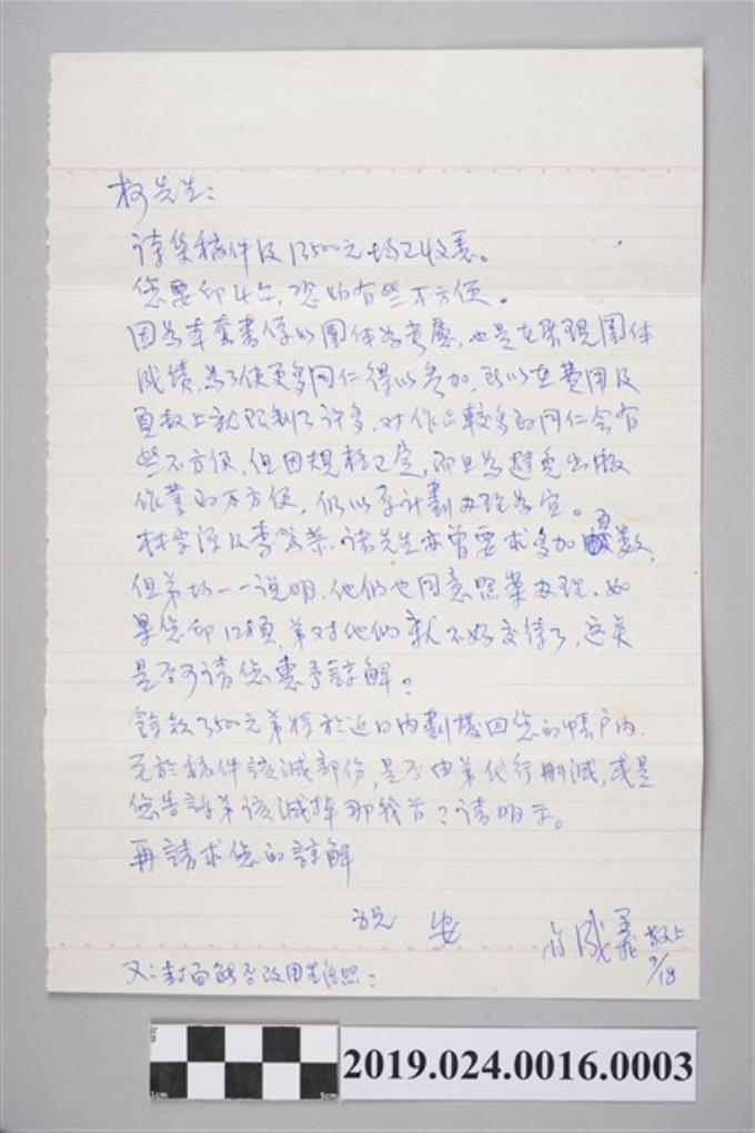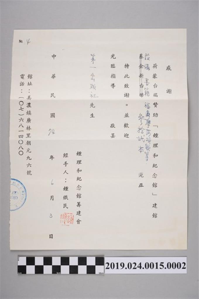 鍾理和紀念館籌建會寄柯旗化感謝函