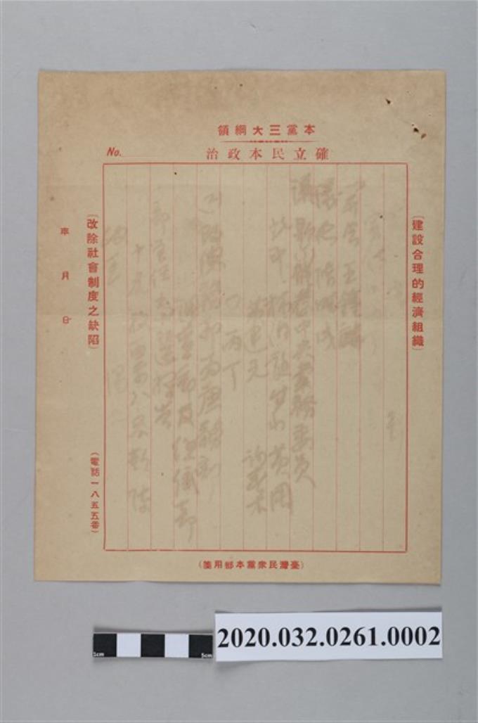 民眾黨三大綱領本部用箋及民眾黨寄大甲街杜香國