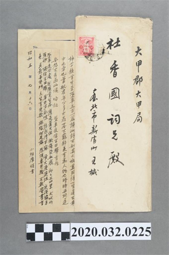 施梅樵以全島聯吟會紀念箋致甲溪書翰信封
