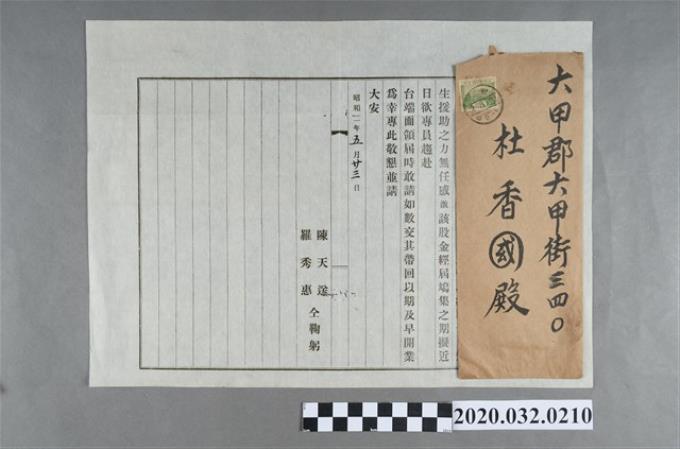 羅秀惠、陳天送邀杜香國入股亞細亞旅館信封