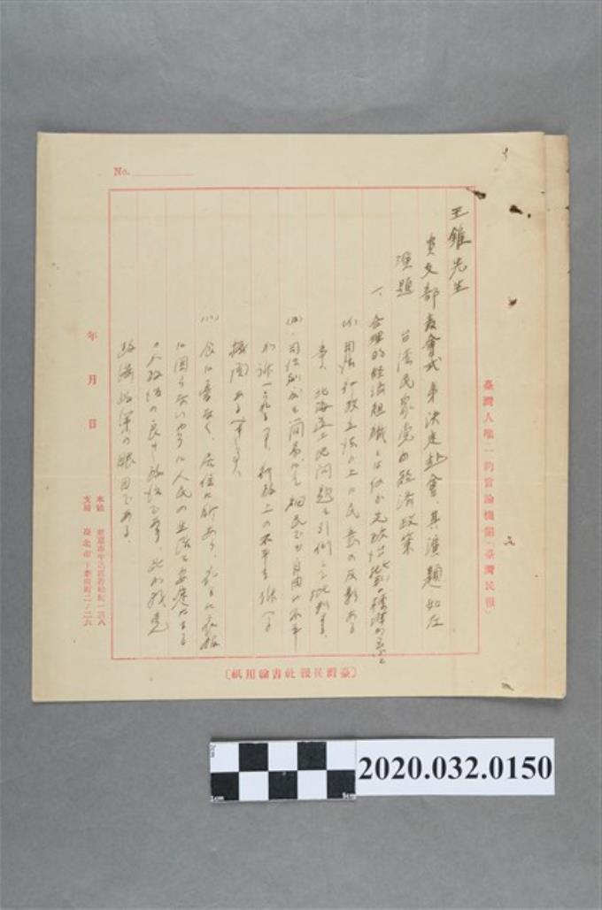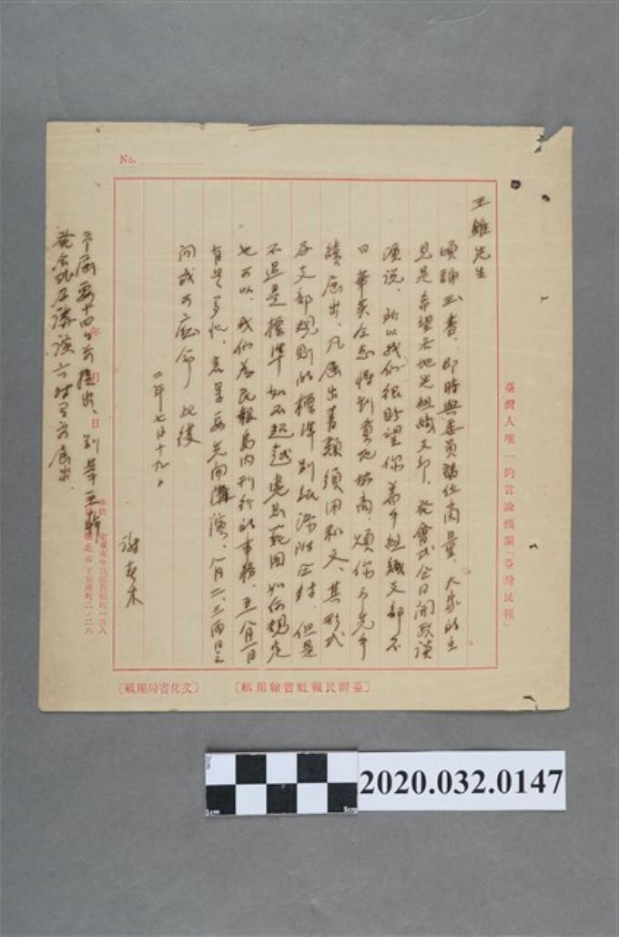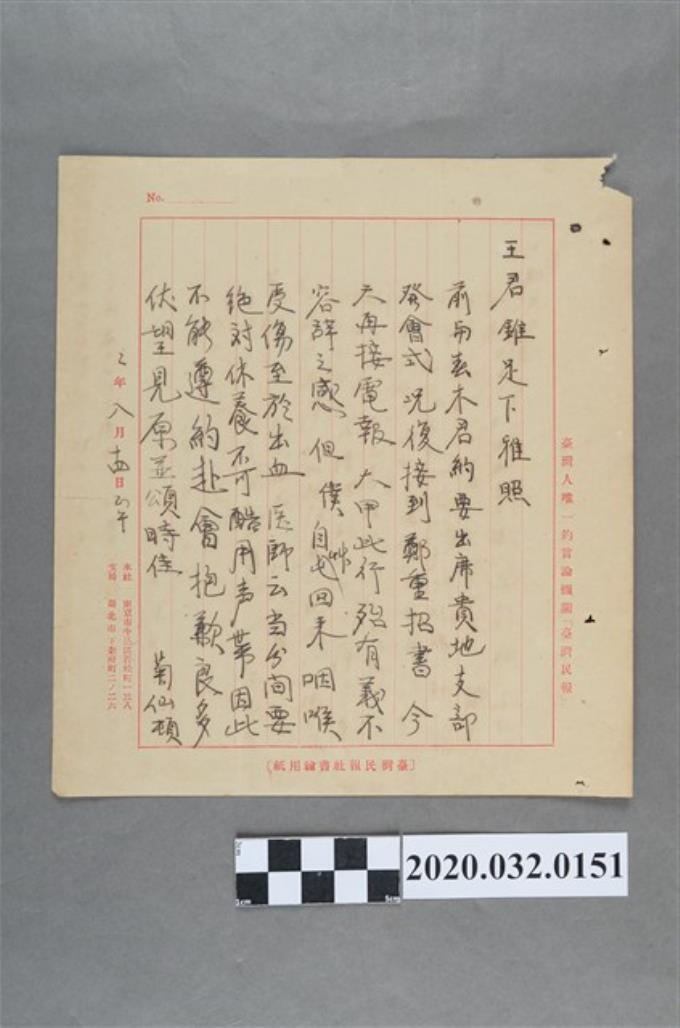 陳旺成致王錐因草屯講演歸來喉嚨發炎,辭卻參加大甲支部創會式講演書翰